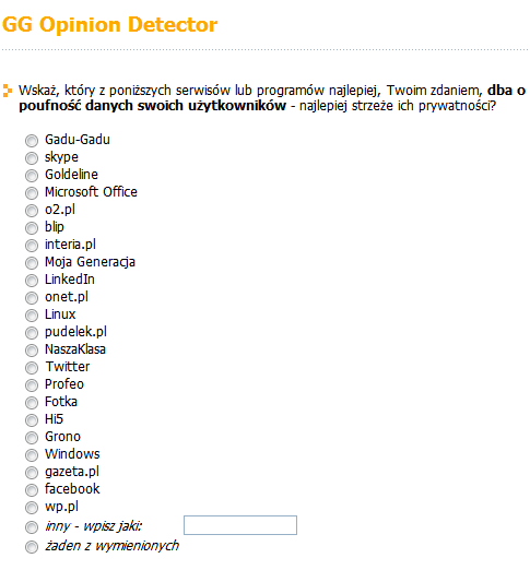 No właśnie – o co? Obszerna ankieta dotyczyła ogólnie produktów spółki oraz poruszała… kwestie religijne. Wybraliśmy kilka pytań, które uznaliśmy za najważniejsze. Pytania o prywatność jak i o portale z newsami sugerują, że firma planuje nieco zmienić kilka wad komunikatora GG10.